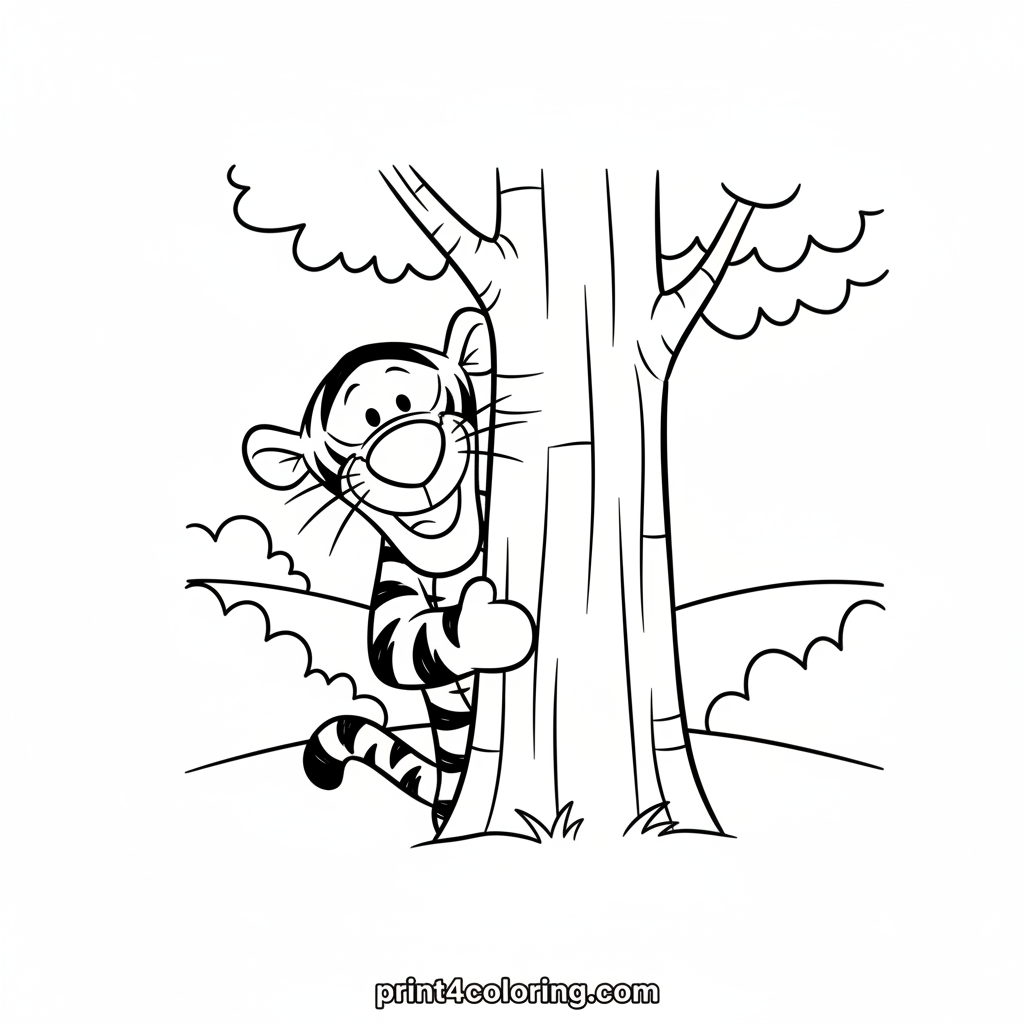Join Tigger in a super bouncy game of hide-and-seek! Our favorite striped friend is peeking playfully from behind a tall, striped tree trunk, ready to surprise you with his famous grin. Use your brightest colors to bring this fun forest scene to life and help Tigger find his friends!