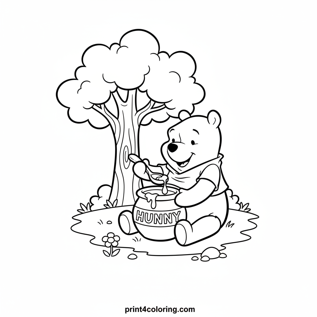 Join Winnie the Pooh under a friendly tree as he enjoys his favorite sweet treat! This delightful scene shows Pooh bear, in his iconic red shirt, happily digging into a large pot of delicious hunny with a big spoon. A perfect page for little hands to color, capturing a moment of pure joy and sweetness.
