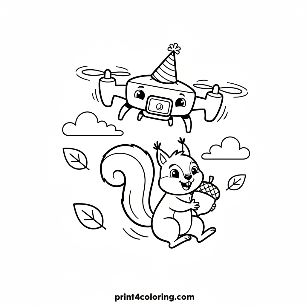 Join a joyful squirrel clutching an acorn as it playfully dodges a cheerful drone wearing a tiny, wobbly party hat! This delightful scene captures a moment of pure fun and friendship in the air. Grab your crayons and bring this whimsical chase to life with vibrant colors!