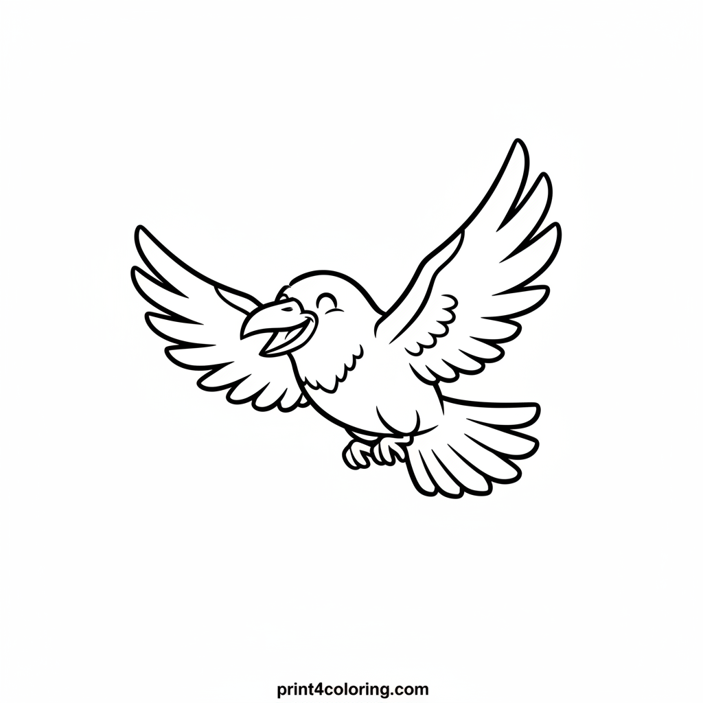 Watch our cheerful raven soar through the bright blue sky! With wings spread wide and a big smile, this happy bird is doing a playful loop-the-loop. Grab your crayons and bring this joyful aerial adventure to life, imagining the wind beneath its wings as it performs its amazing sky dance!