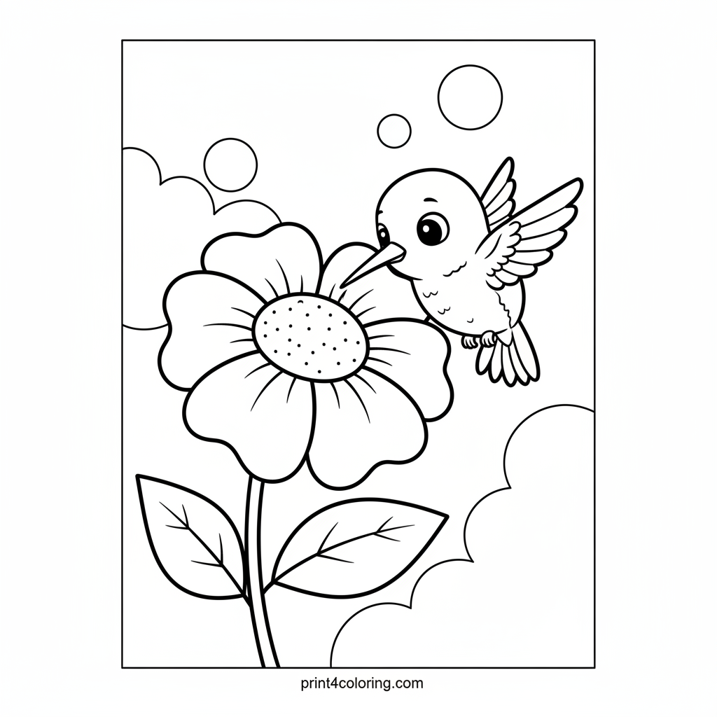 Watch this adorable baby hummingbird as it discovers the sweet taste of nectar for the very first time! With its big, curious eyes, it gently sips from a friendly flower, surrounded by simple leaves and a soft, bubbly background. A perfect scene for little artists to bring to life with bright, happy colors!
