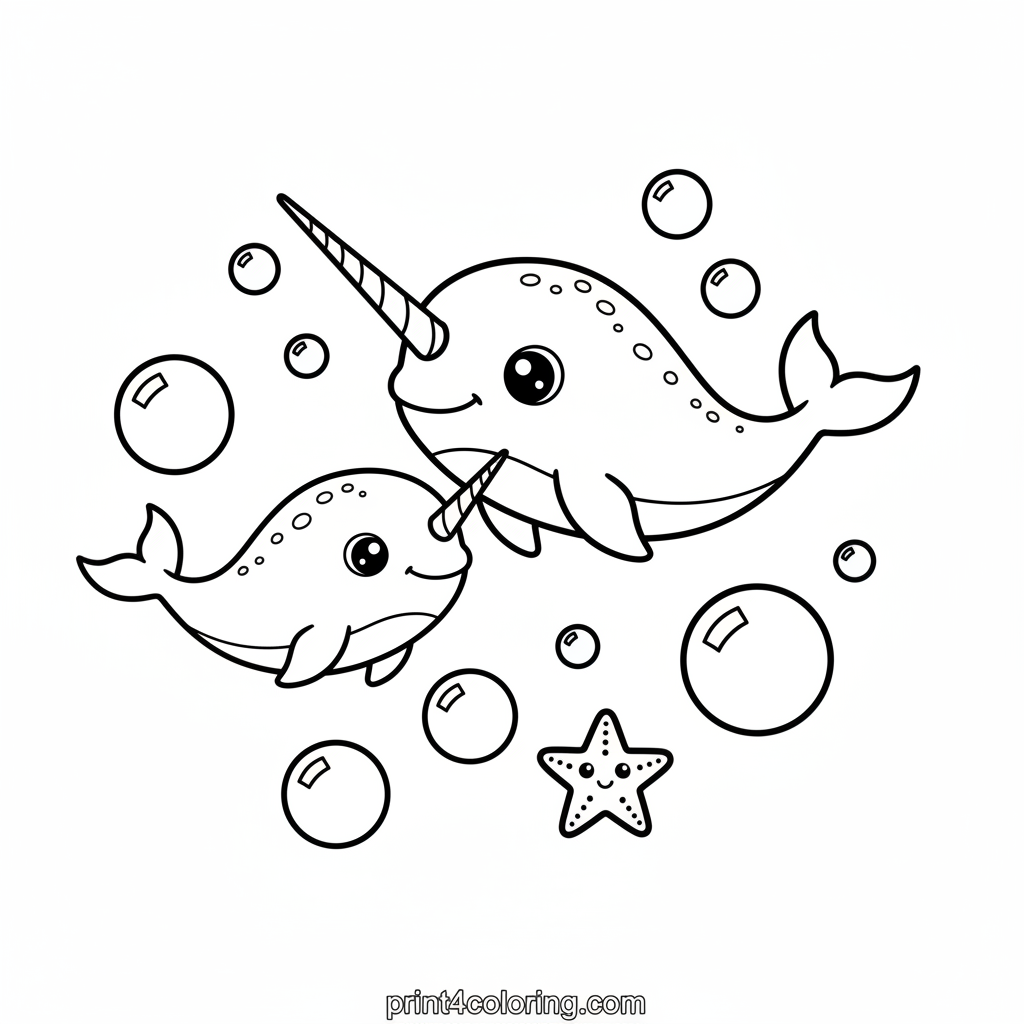 Dive into an enchanting underwater world with our adorable baby narwhal! Watch as this little unicorn of the sea takes its first gentle swim alongside its loving parent. Surrounded by playful bubbles and a tiny, smiling starfish, this scene is perfect for little artists to bring to life with their favorite colors. A heartwarming ocean adventure awaits!