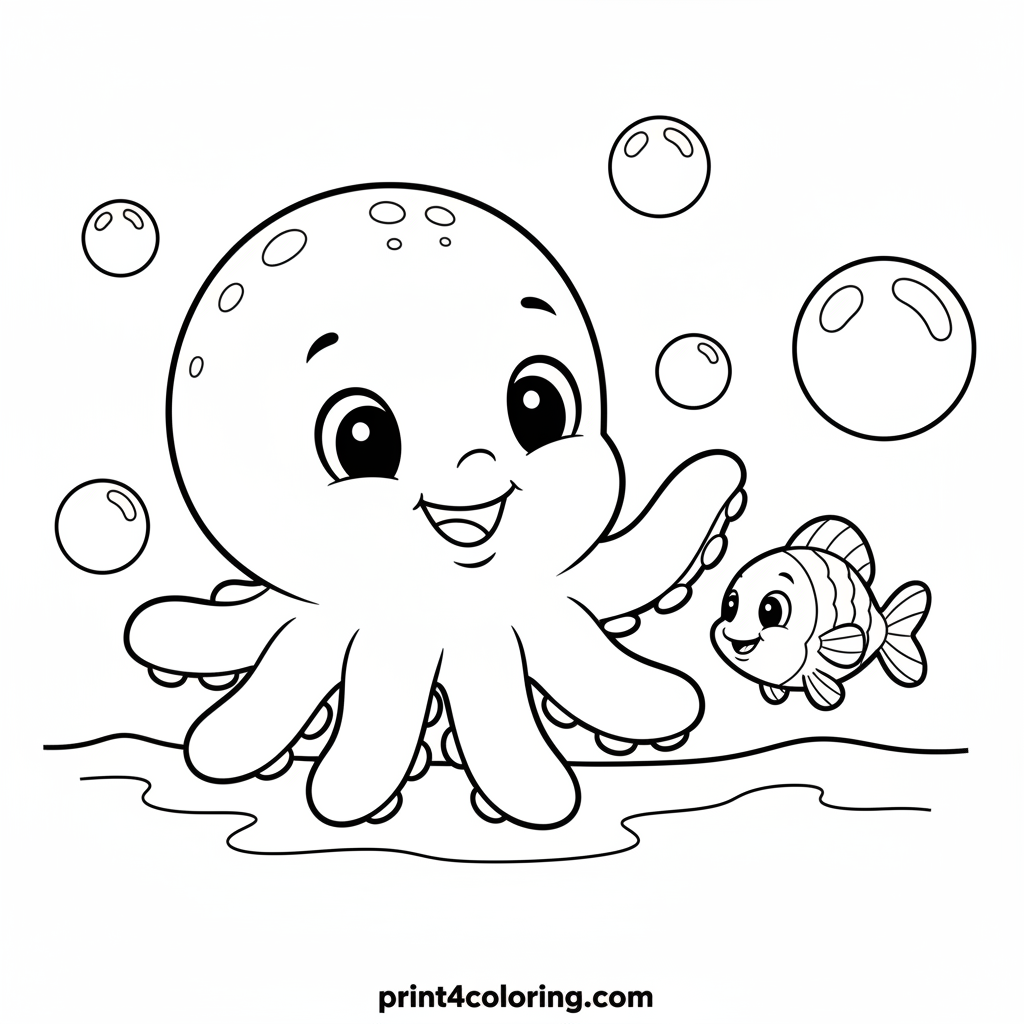 Join Baby Ollie the Octopus on his first swim! This super cute baby octopus, with big happy eyes, gently floats in clear water. He's making a new friend by softly touching a small, smiling fish. Soft, round bubbles float around them. Color this heartwarming underwater adventure!
