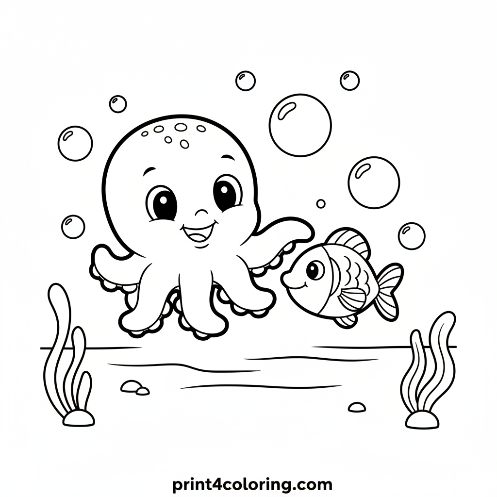 Join Baby Ollie the adorable octopus on his very first swim in the sparkling blue ocean! With big, happy eyes, Ollie gently floats, reaching out a tentacle to say hello to a tiny, smiling fish. Soft, round bubbles drift around them, making this underwater scene extra magical and sweet. A perfect page for little artists!