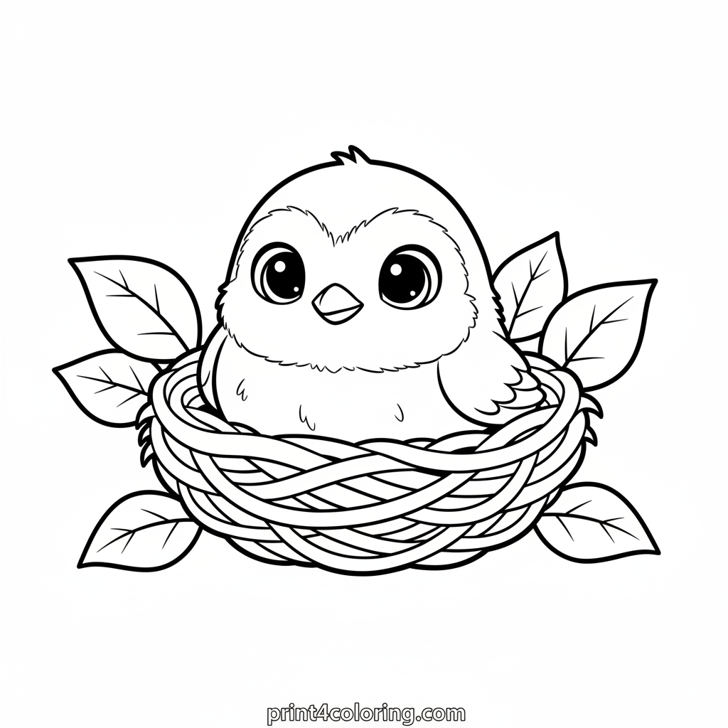 Meet an adorable baby robin, just beginning to explore the world! With its big, curious eyes, it peeks shyly from its cozy nest, nestled among soft, green leaves. Imagine the vibrant colors you can use to bring this sweet bird and its safe home to life. A perfect scene for little artists to color and enjoy!