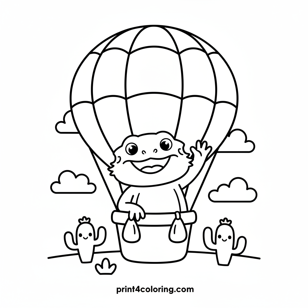 Join a cheerful bearded dragon on an amazing hot air balloon adventure! Watch as it waves from its colorful basket, gently drifting above a whimsical desert filled with smiling cacti and fluffy clouds. This easy coloring page invites you to add your favorite hues to a friendly, high-flying journey.