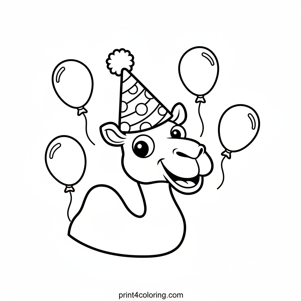 Join a very happy camel sporting a giant, colorful party hat and a super silly grin! A few festive balloons float around, making this scene extra cheerful. Get ready to add vibrant colors to this hilarious desert celebration and bring the party to life with your crayons!
