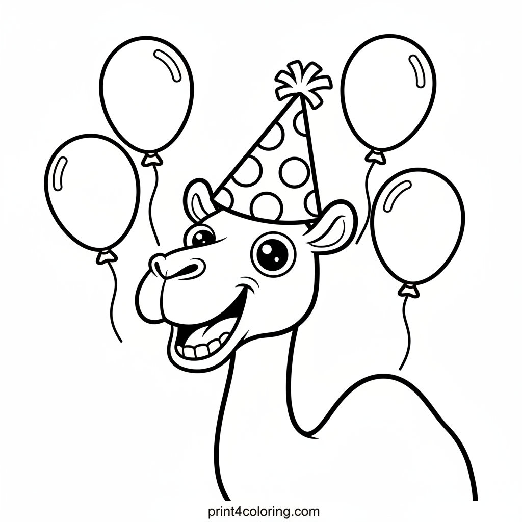 Meet our cheerful camel, ready to party! He's wearing a giant, brightly colored party hat and a goofy grin that will make you smile. With fun, floating balloons all around, this page is perfect for your most vibrant colors. Get ready for a silly, sandy celebration!