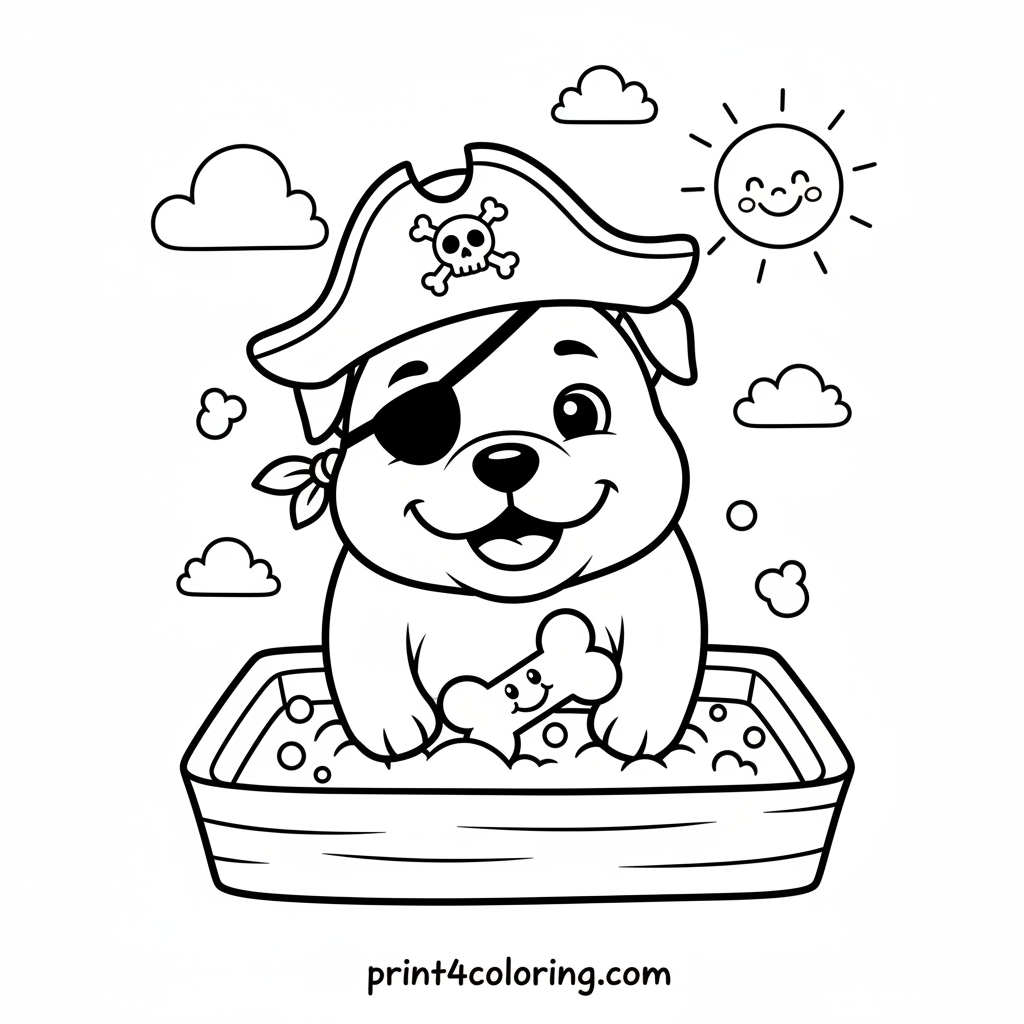 Ahoy, matey! Meet Captain Digs-a-Lot, the cutest pitbull pirate. Wearing a tiny hat and eye patch, he's on a thrilling quest, digging for his favorite 'treasure' – a yummy bone – in a sandbox. Grab your crayons and bring this playful pup's adventure to life!