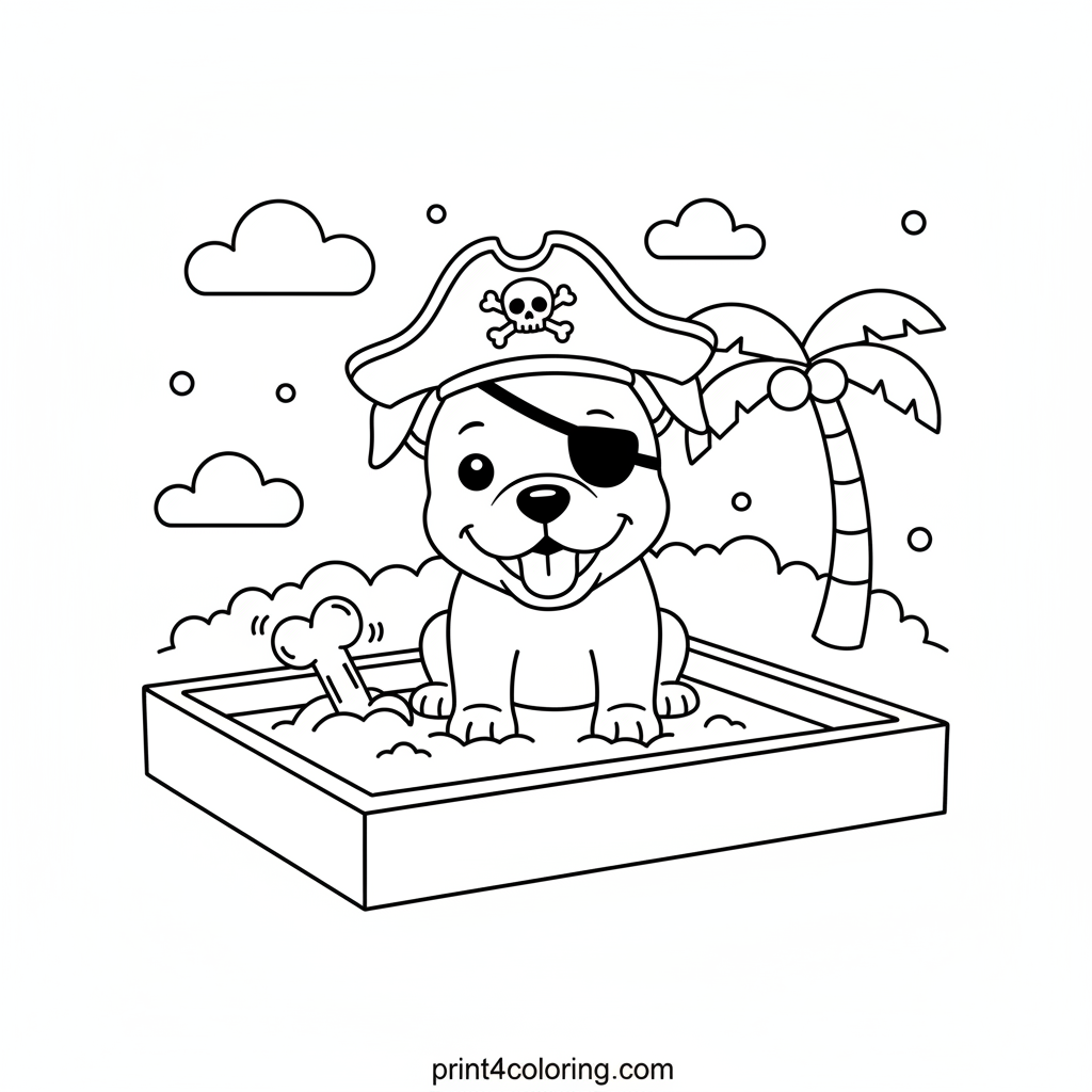 Ahoy, matey! Join Captain Paws, the cutest pirate pup, on a grand adventure! This playful pitbull, sporting a soft pirate hat and eye patch, is busy digging for his buried treasure – a yummy bone – in a sandy sandbox. Grab your crayons and help him uncover his favorite treat in this adorable scene!