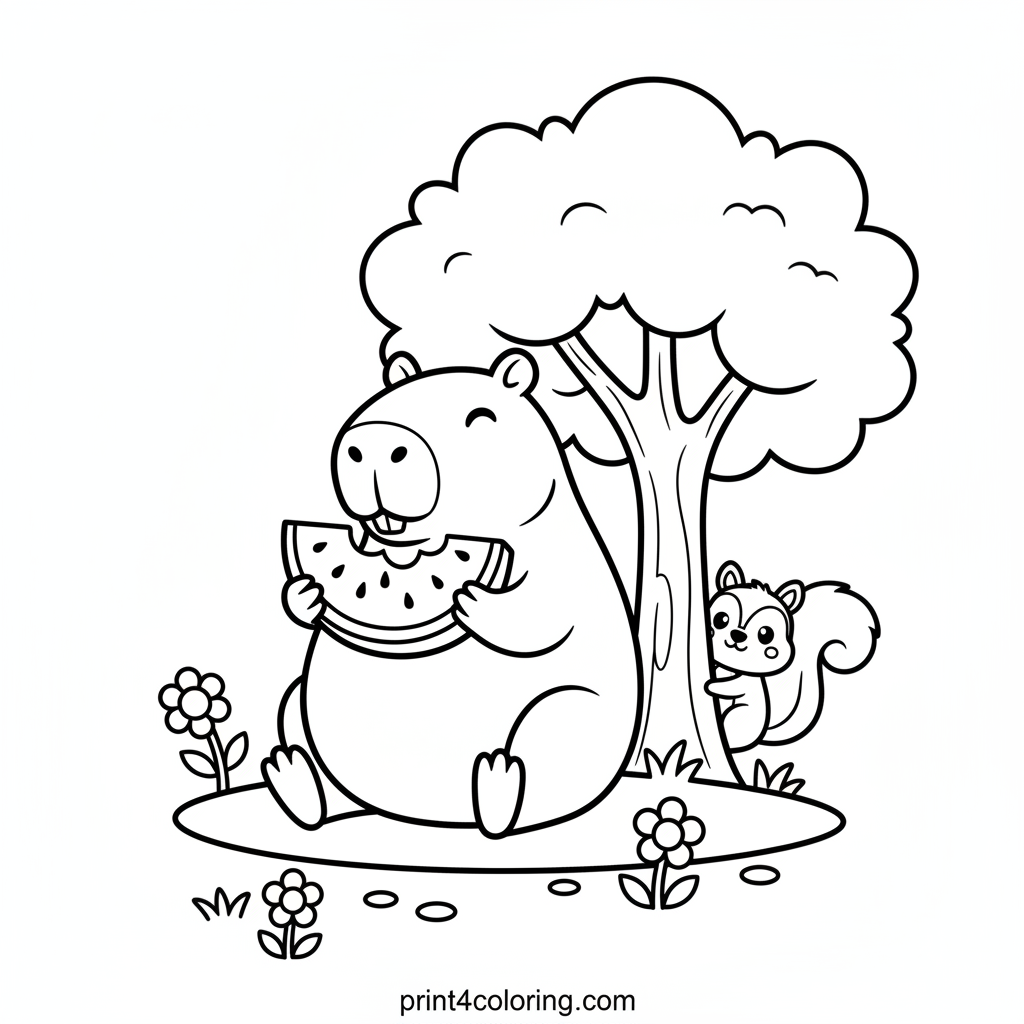 Join a very happy capybara as it enjoys a delicious slice of watermelon by a friendly tree. Look closely, and you'll spot a cute, smiling squirrel playfully peeking out from behind the trunk. This delightful scene is perfect for little artists to bring to life with their favorite colors!