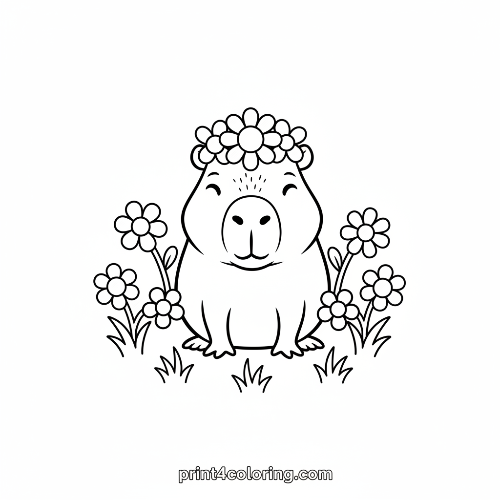 Meet a gentle capybara enjoying a sunny meadow! This friendly creature wears a beautiful crown of cheerful flowers, surrounded by more lovely blossoms. Grab your crayons and add vibrant colors to this peaceful scene, bringing the capybara's flowery world to life with your imagination!