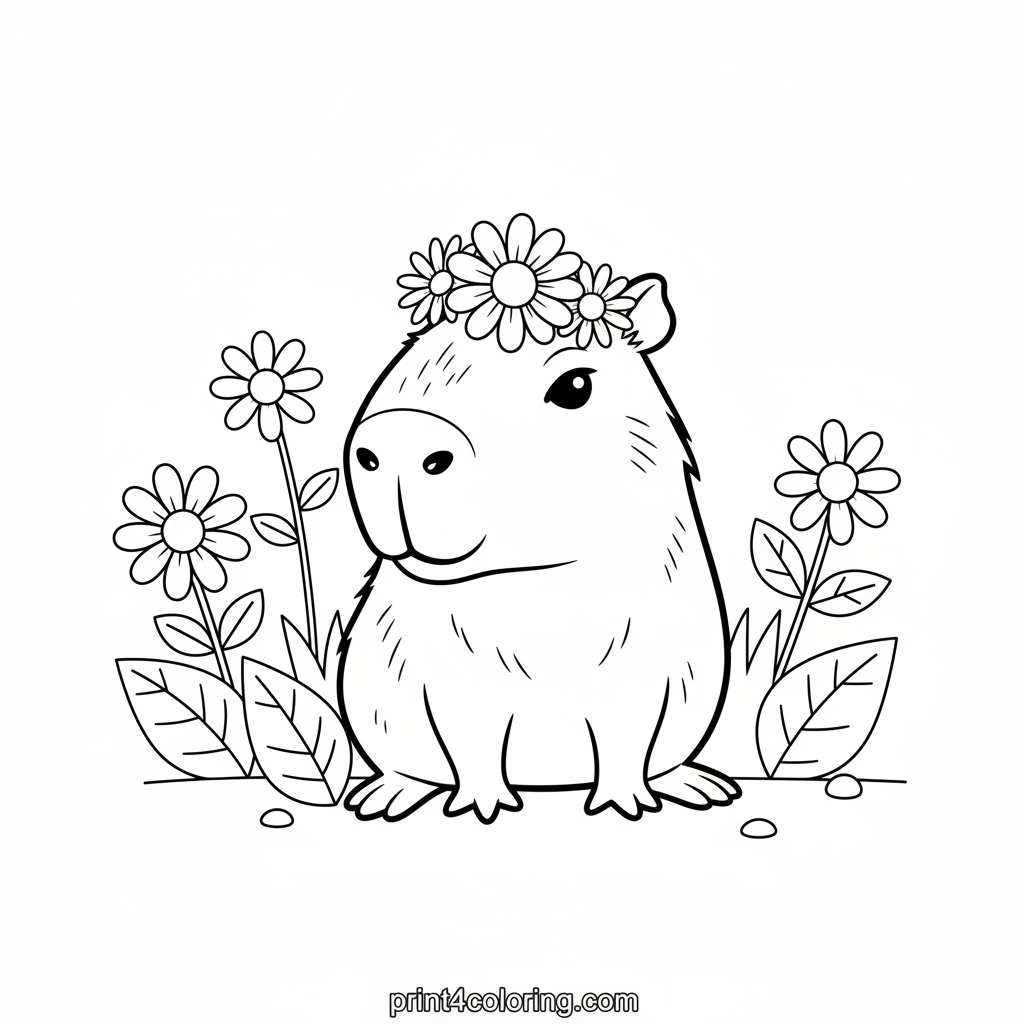 Meet a gentle capybara enjoying a sunny day in a beautiful meadow! This friendly giant is wearing a lovely crown made of big, cheerful flowers on its head, surrounded by even more happy blossoms. Grab your favorite colors and bring this adorable scene to life, making the capybara and its flowery world vibrant and bright!