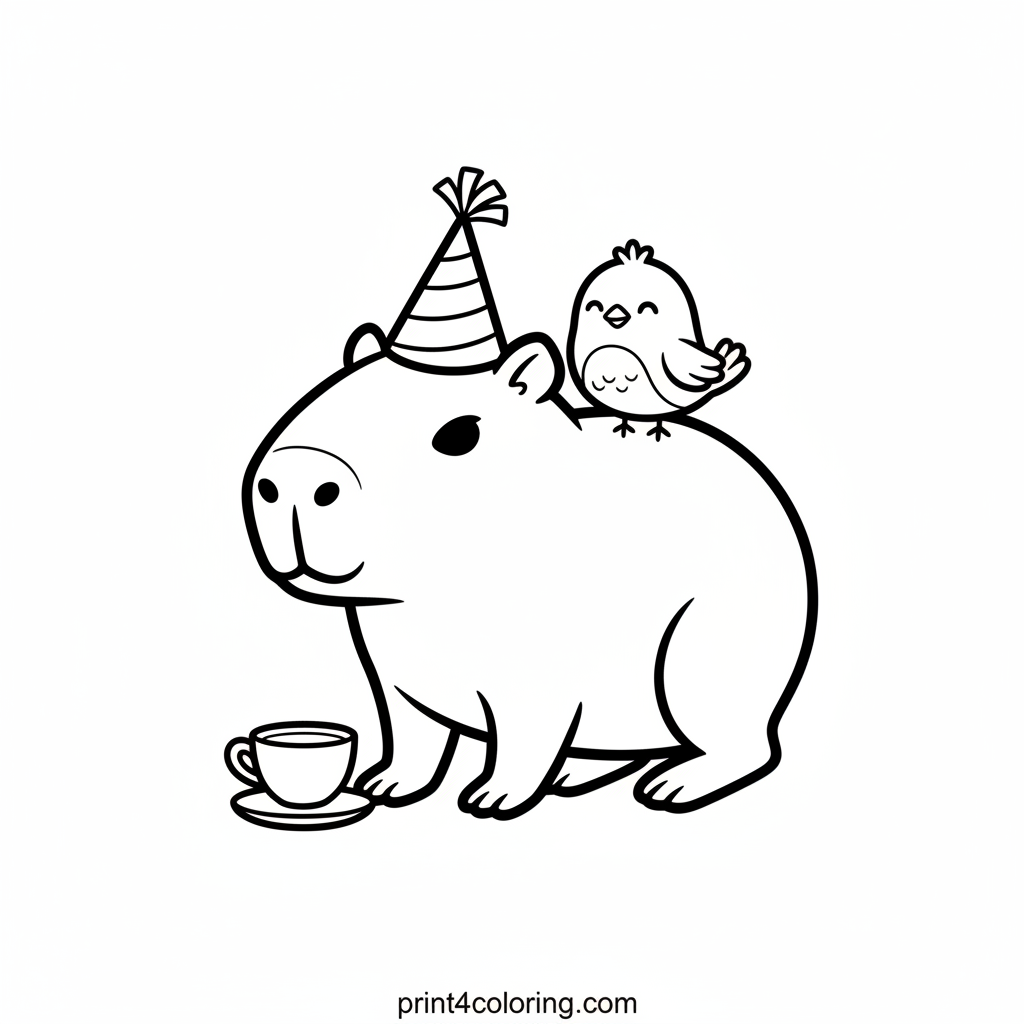 A silly capybara hosts a charming tea party! Wearing a tiny, colorful party hat, it shares pretend tea with a cheerful bird friend perched on its back. Imagine all the fun colors for their hats, cups, and the cozy setting. This delightful scene celebrates friendship and gentle joy, perfect for easy coloring.