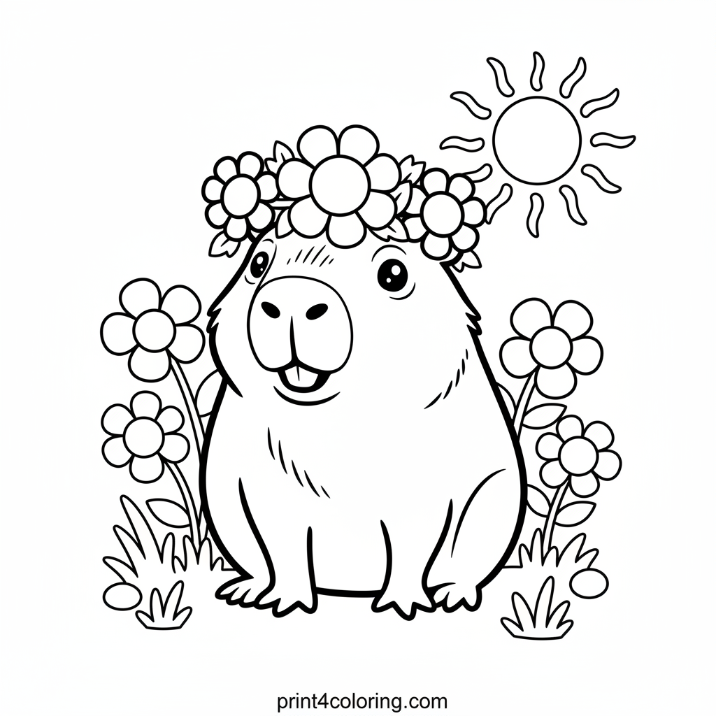 Meet a gentle capybara enjoying a sunny day in a beautiful meadow. This friendly creature wears a lovely crown of big, cheerful flowers, surrounded by more friendly blossoms. Get ready to add bright colors to this peaceful scene and bring this adorable capybara to life!