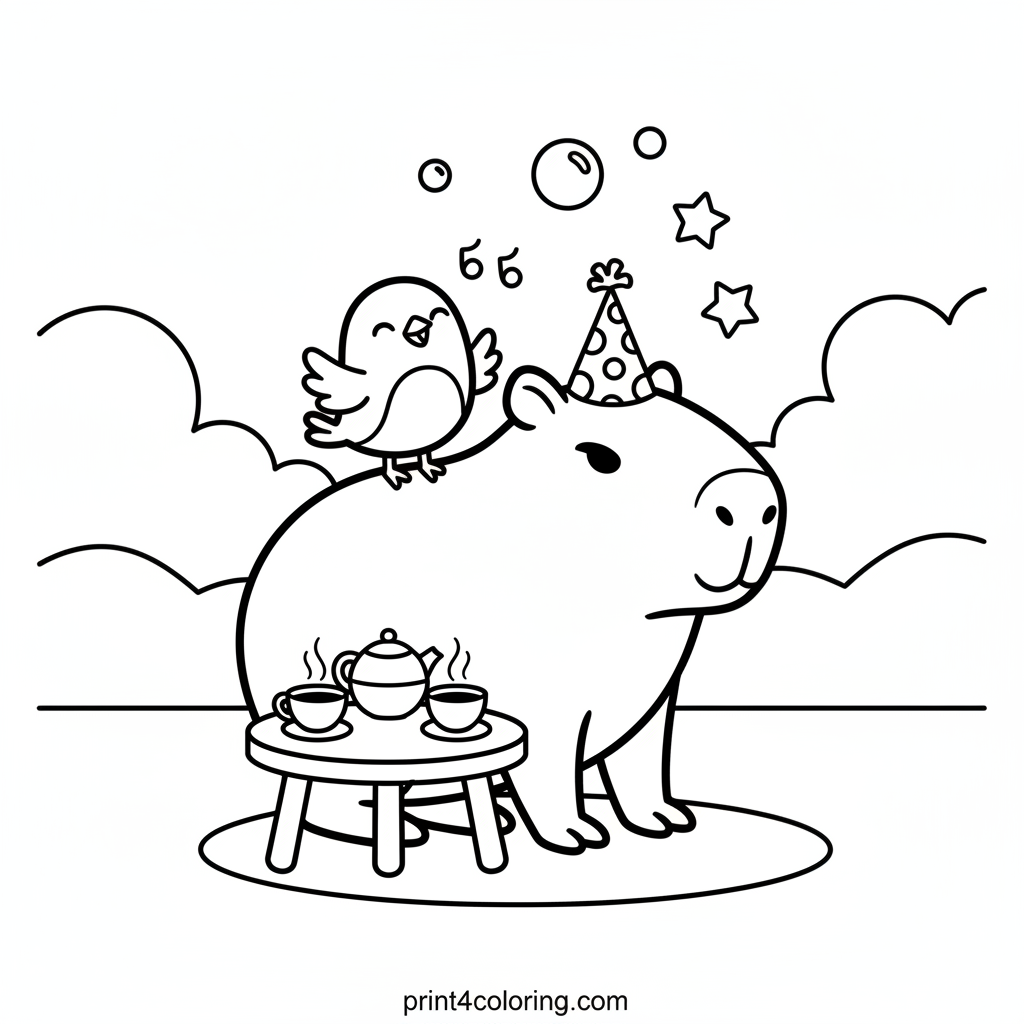 Meet a cheerful capybara sporting a tiny, colorful party hat, hosting a delightful pretend tea party! A small, smiling bird perches on its back, ready to share imaginary treats. This adorable scene is perfect for little artists to bring to life with their favorite colors, celebrating friendship and fun.
