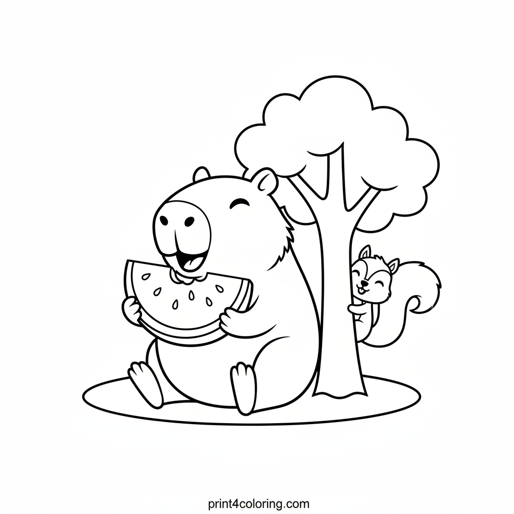 Join a cheerful capybara as it enjoys a delicious watermelon feast under a friendly tree! A cute, smiling squirrel peeks out, curious about the tasty treat. This delightful scene is perfect for young artists to bring to life with bright colors and imagination. Get ready for some fruity fun!