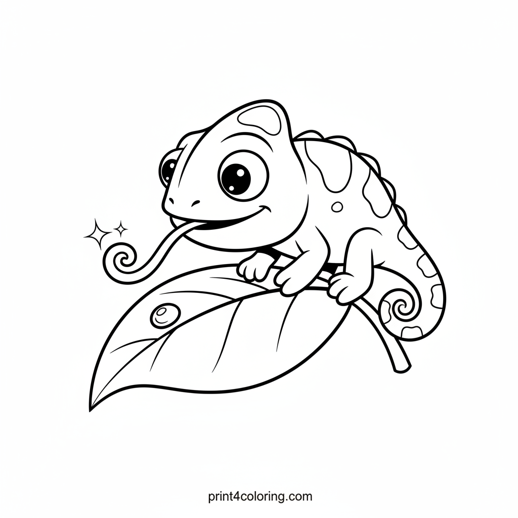 Get ready to color a charming scene! A playful chameleon is reaching out its super long, sticky tongue to gently touch a sparkling dewdrop resting on a big, smooth leaf. Imagine the vibrant colors of its skin and the glistening drop, all waiting for your artistic touch. A delightful moment in nature!
