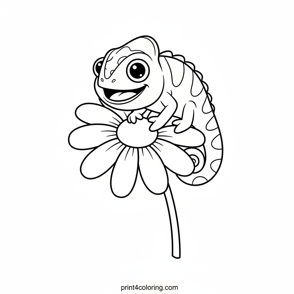 Meet our delightful chameleon friend, happily perched on a cheerful daisy! With its big, friendly eyes and a gentle smile, this little reptile is ready for a burst of color. Its tail is curled just right, inviting you to bring this simple, charming scene to life. Grab your crayons and make this flower and its visitor shine!