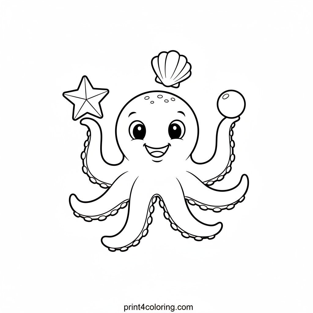 Meet a cheerful octopus having juggling fun! This eight-armed friend playfully tosses a sparkling star, a pretty shell, and a shiny pearl. With a happy, focused smile, it invites you to bring its undersea show to life. Grab your crayons and add vibrant colors to this joyful scene!