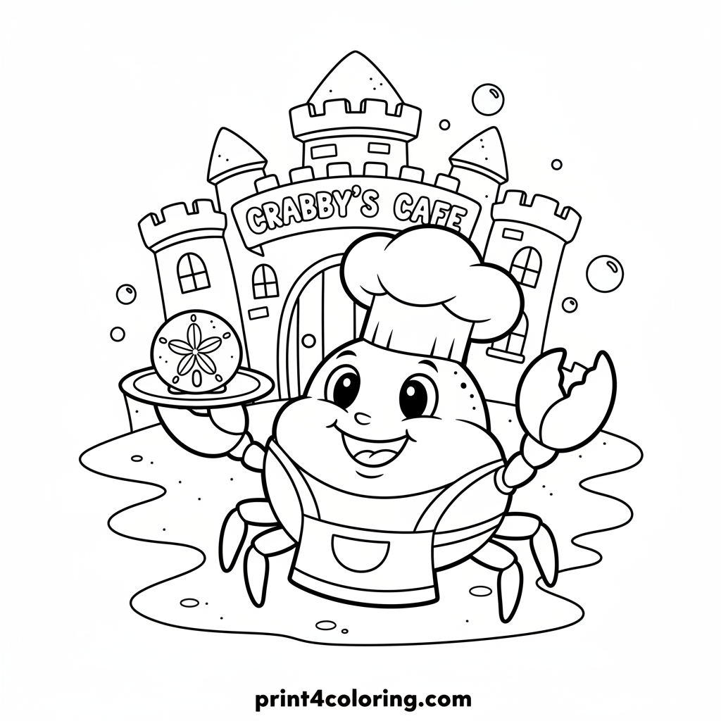 Meet Chef Crab, busy at his charming sandcastle restaurant! This cheerful little crab, wearing a tiny chef's hat and apron, is proudly serving a delicious sand dollar on a seashell platter. Bring this sunny beach scene to life with your favorite colors and imagine the seaside delights!