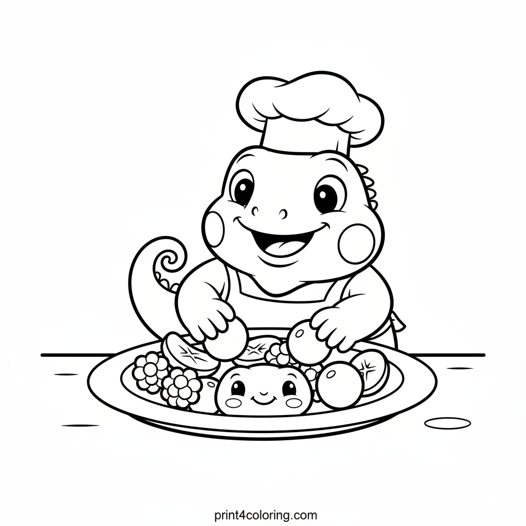 Meet Chef Iggy, the happiest iguana in the kitchen! He's wearing his chef's hat and apron, busily arranging a delightful fruit feast. Imagine juicy berries and sweet banana slices piled high on a giant, smiling plate. Get ready to add your favorite colors to this joyful and healthy scene!