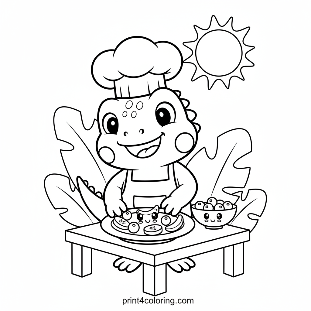 Join Chef Iggy, the happiest iguana in the kitchen, as he prepares a vibrant fruit feast! Watch him carefully arrange juicy berries and sweet banana slices on a big, cheerful plate. This playful scene is perfect for little artists to color with bright, happy colors, bringing Iggy's delicious creation to life.