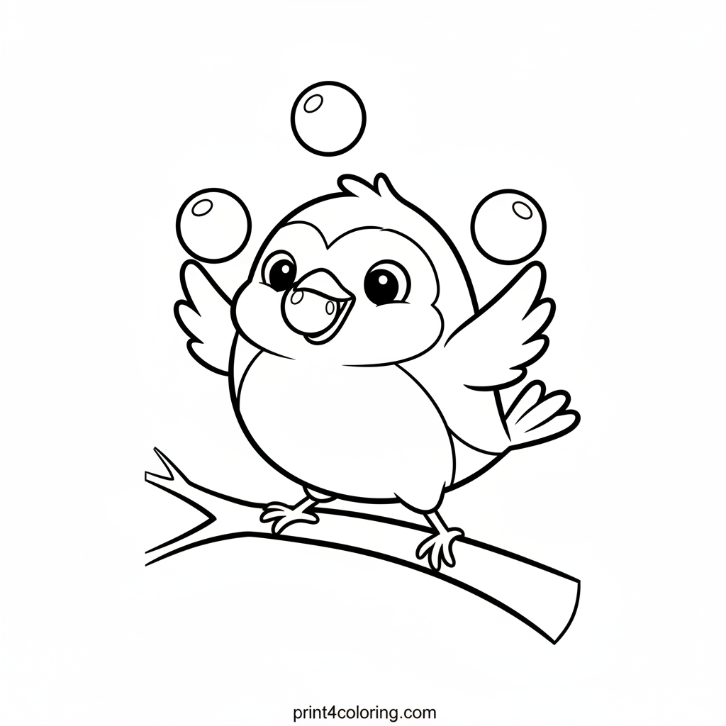 Get ready for a giggle! Our cheerful robin is attempting a hilarious juggling act, trying to balance three bright red berries with its beak and tiny wings. It looks a little clumsy but incredibly happy. This adorable scene is perfect for young artists to bring to life with vibrant colors.