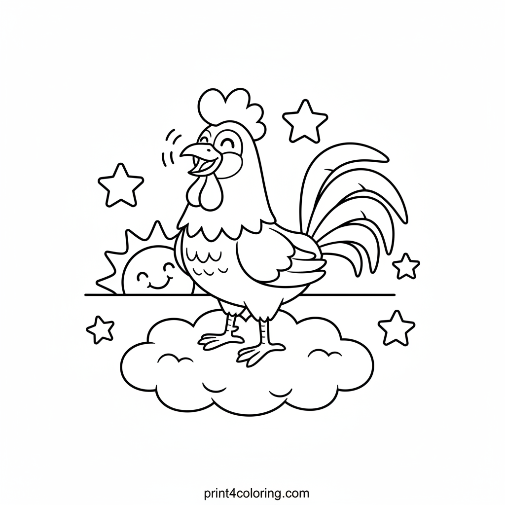 Imagine a friendly rooster perched on a fluffy cloud, gently crowing a beautiful morning song! He's calling the sun to rise, surrounded by a sky full of sparkling stars. This enchanting scene invites you to add vibrant colors to his feathers, the soft cloud, and the magical starry background. A perfect picture to brighten your day!