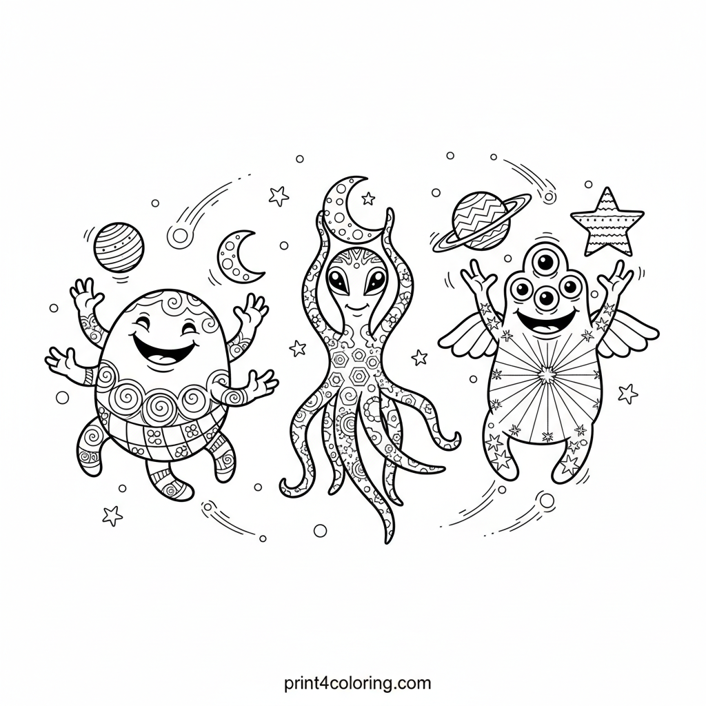 Dive into a whimsical cosmic scene where three hilarious space critters defy gravity! Watch them comically juggle tiny, patterned planets and moons amidst a swirl of sparkling stardust. This intricate page invites you to bring their unique shapes and the boundless universe to life with your most imaginative colors.