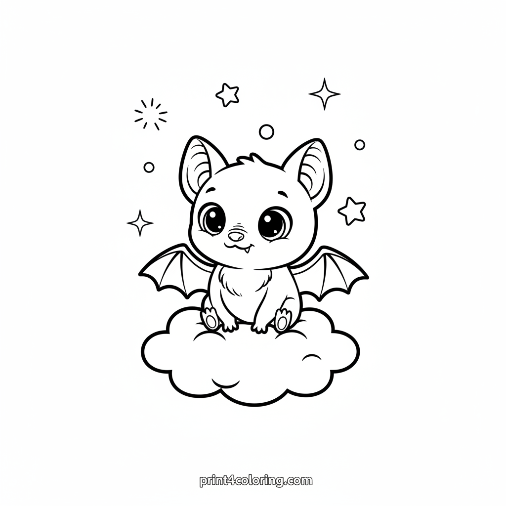 Imagine a sweet little bat, perched softly on a fluffy cloud, with big, curious eyes gazing up at the twinkling night sky. This enchanting scene invites you to add vibrant colors to the sparkling stars, the soft cloud, and our adorable bat friend as they dream among the cosmos. Perfect for a peaceful coloring adventure!