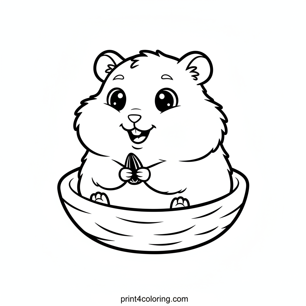 Get ready to color a super cute and fluffy hamster enjoying a delicious snack! This little friend has big, sparkly eyes and is happily nibbling a tiny sunflower seed. He's snuggled up in his soft, simple nest, making for a perfect, peaceful scene. Bring this adorable moment to life with your favorite colors!