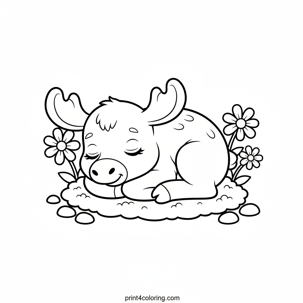 Snuggle up with this adorable coloring page featuring a plump baby moose calf. With big, soft eyes closed, this little one is fast asleep, nestled in a cozy bed of green moss and colorful wildflowers. Imagine the peaceful forest sounds as you bring this sleepy scene to life with your favorite colors.