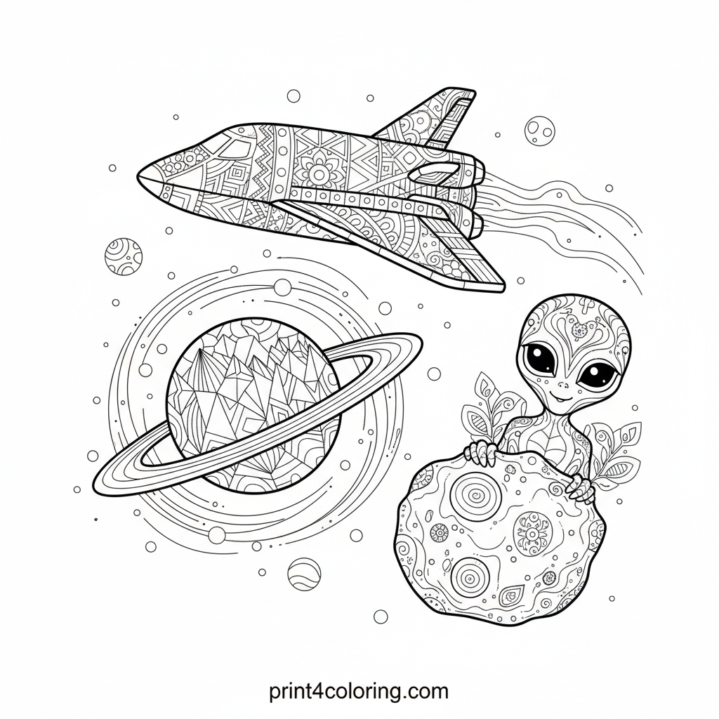 Embark on an epic space journey! A futuristic shuttle glides past a breathtaking ringed planet, its mountains sparkling with glowing crystals. Swirling nebulae dance in the background, while a curious, friendly alien peeks from behind a patterned asteroid. Capture the magic of this alien world with your colors!
