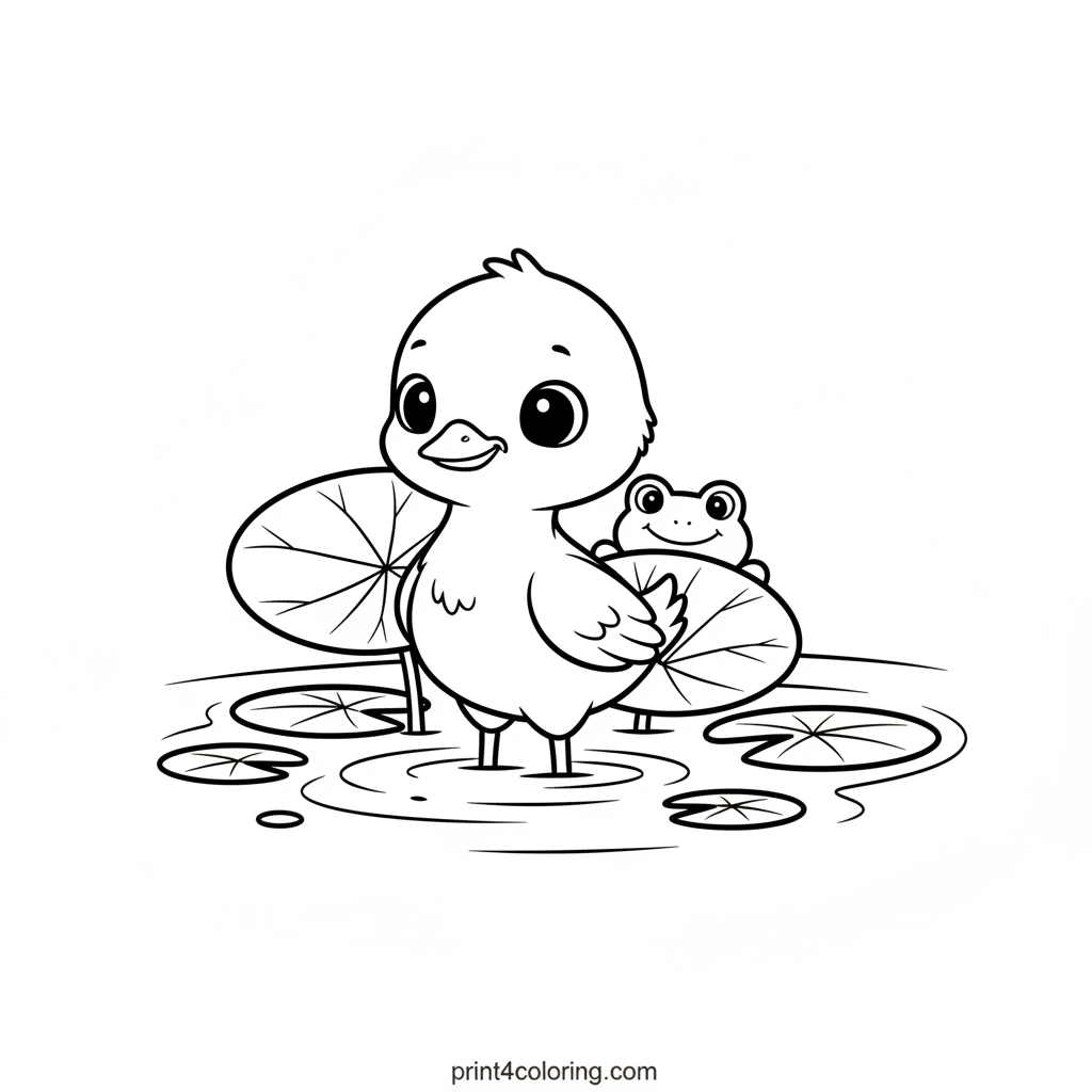 Dive into a delightful scene where a sweet baby crane chick, with its big, wondering eyes, experiences its very first splash! A tiny, green frog friend peeks out from behind a vibrant lily pad, sharing in the fun. This charming page captures a moment of discovery and new friendship in the peaceful pond.