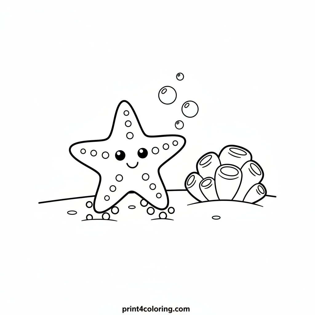 Dive into an underwater world with a curious starfish! Watch as it slowly 'walks' across the sandy seafloor using its amazing tube feet. It's on a special journey towards a beautiful, rounded coral home, with playful bubbles floating all around. Get ready to add vibrant colors to this peaceful ocean scene!