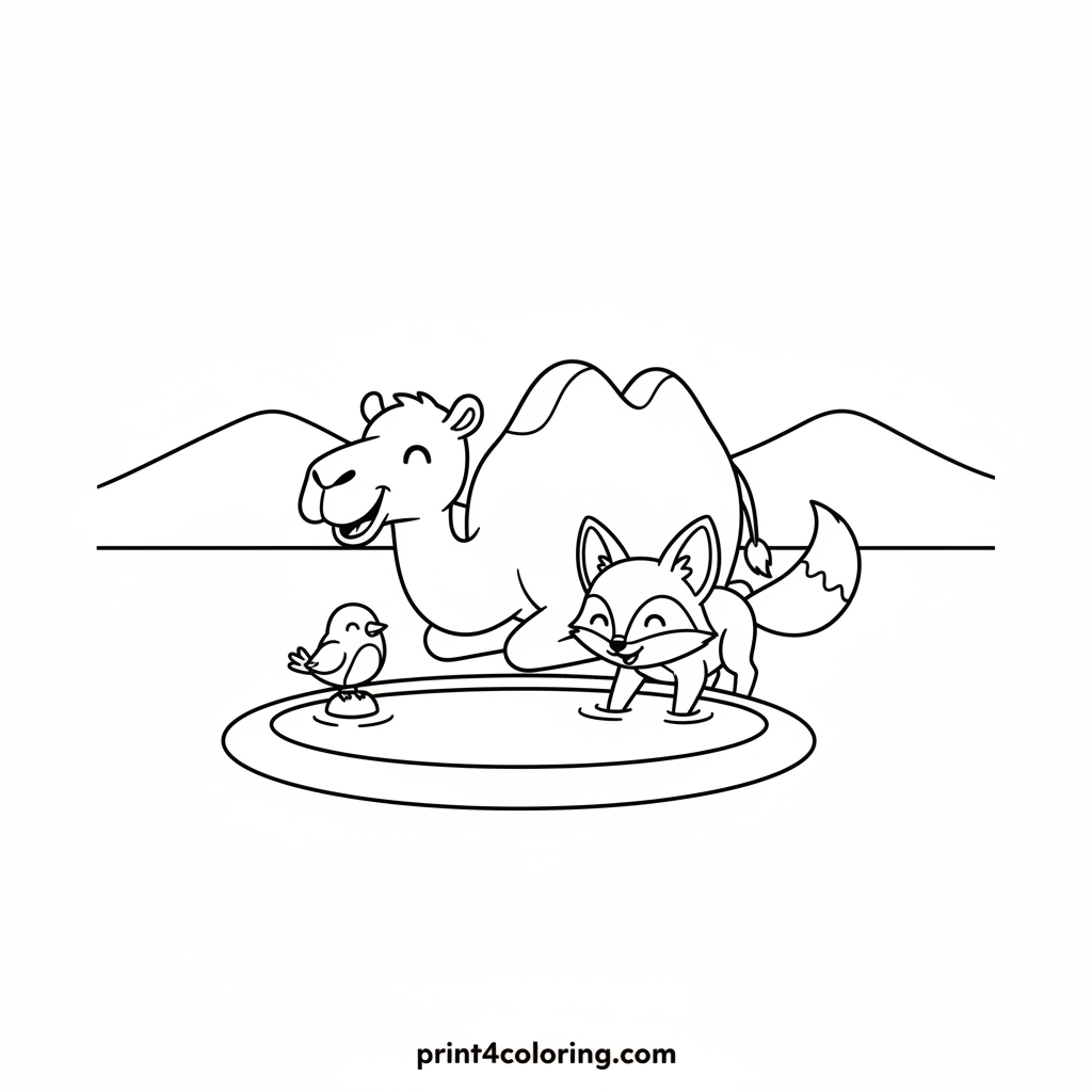 Meet a kind camel bending down to share a cool drink from a sparkling desert pool with a cute desert fox and a little bird. This heartwarming scene celebrates friendship and generosity in the vast desert. Bring this friendly oasis to life with your favorite colors!