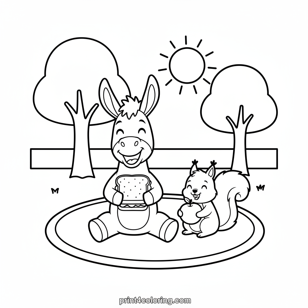 Donkey's Delightful Picnic with Squirrel Friend Coloring Page