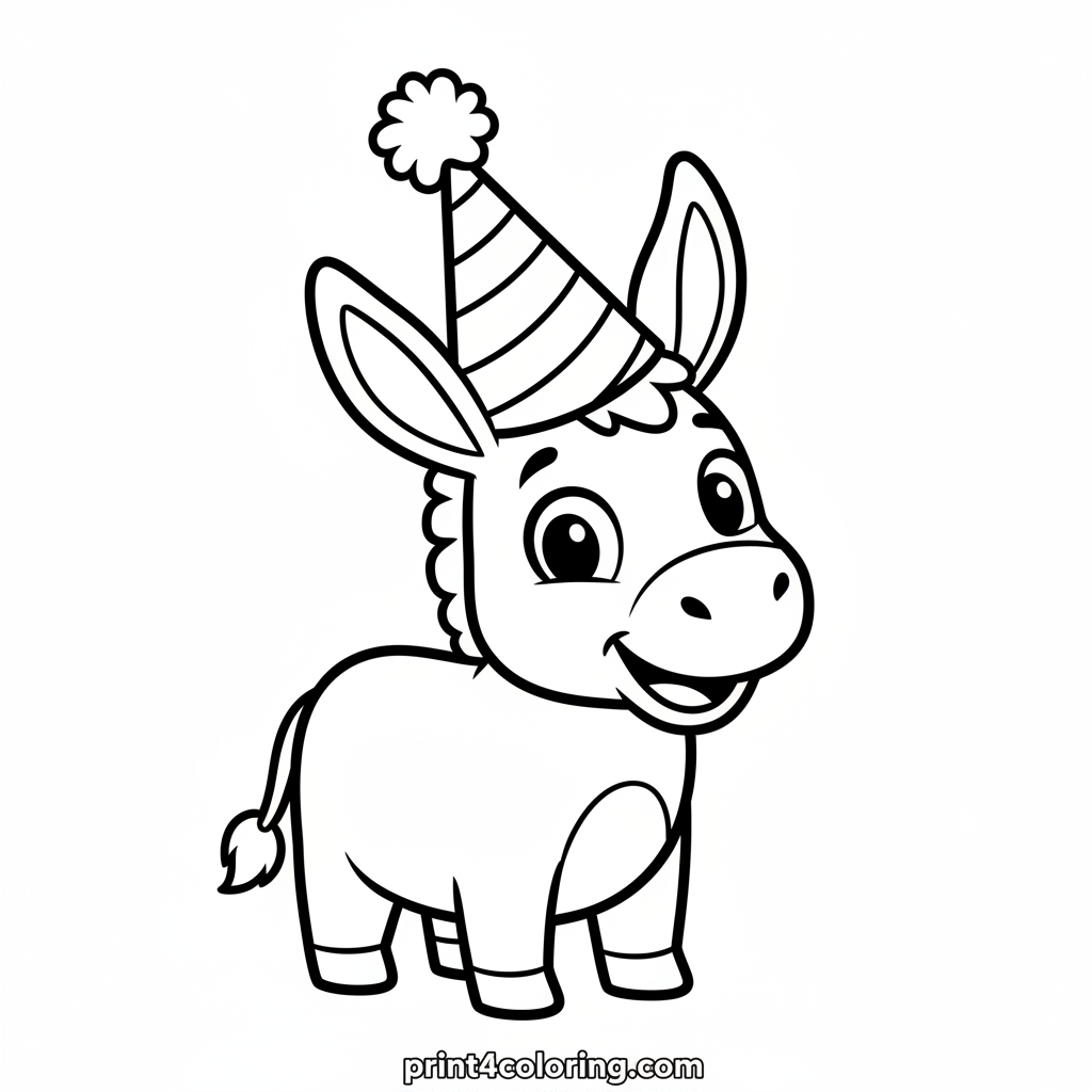 Meet our happy donkey, ready for a silly hat parade! He's wearing a comically large, brightly striped party hat, tilted just right. With a cheerful expression, this friendly fellow is waiting for your creative colors. Bring this fun scene to life and make his hat the star!