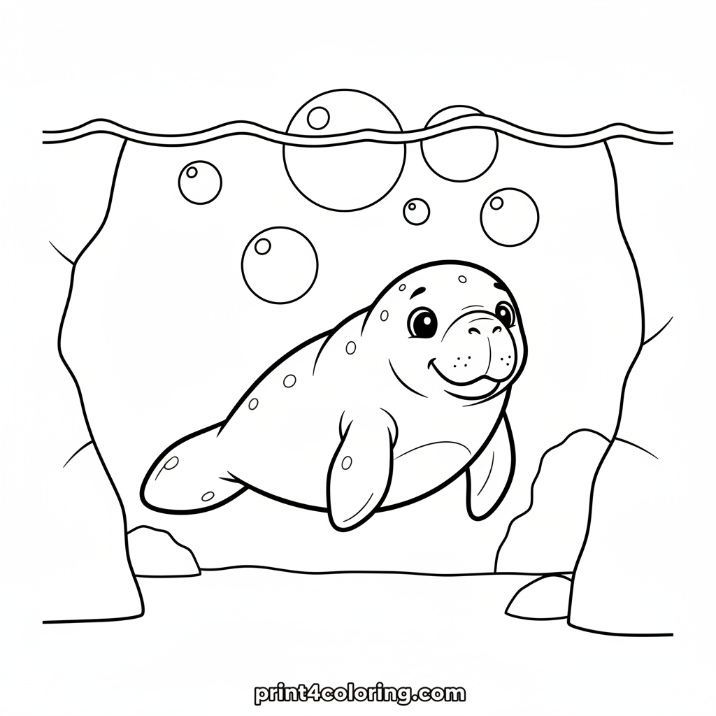 Dive into a magical underwater world where a gentle manatee floats peacefully. In its secret cavern, it gazes up at shimmering 'stars' dancing on the water's surface. Imagine the soft glow and sparkling reflections as you bring this tranquil scene to life with your favorite colors!