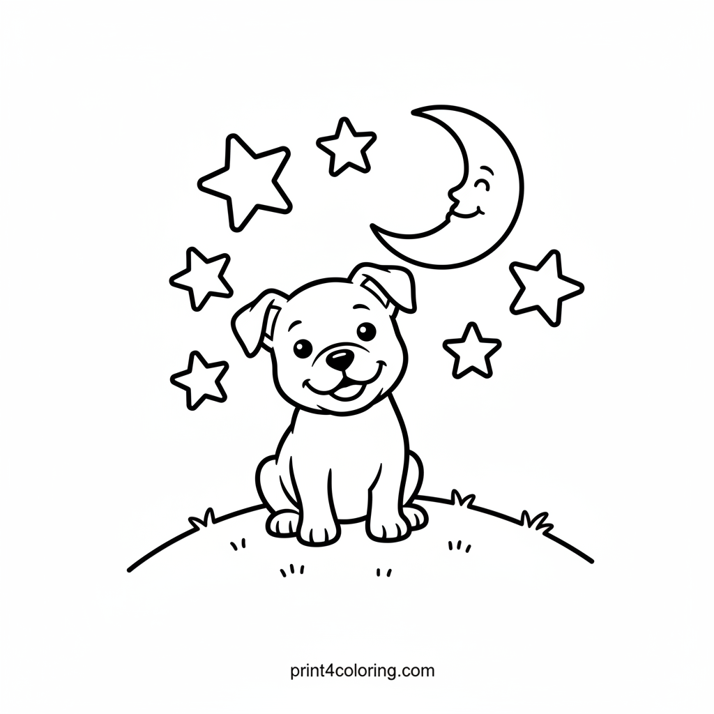 A sweet pitbull finds a cozy spot on a grassy hill, gazing up at a sky full of twinkling stars and a friendly crescent moon. Imagine the wonderful dreams this happy dog is having! Grab your crayons and bring this magical, peaceful scene to life with your favorite colors. Perfect for aspiring astronomers and dog lovers of all ages.