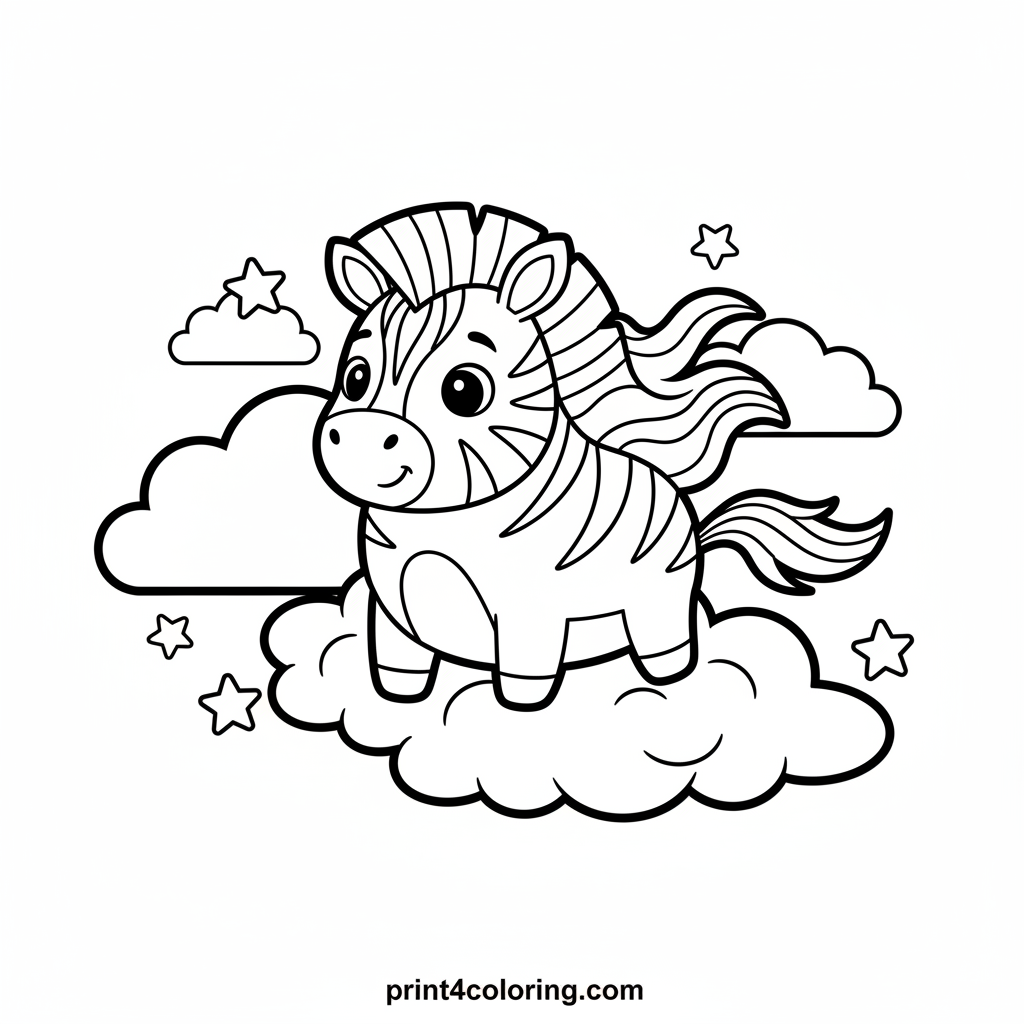 Meet a gentle zebra with a spectacular secret! This special zebra has a mane and tail that shimmer with all the colors of the rainbow. It's peacefully floating high above, gliding through soft, fluffy clouds. Tiny, twinkling stars sparkle around its magical journey. Get ready to color a truly magical sky adventure!