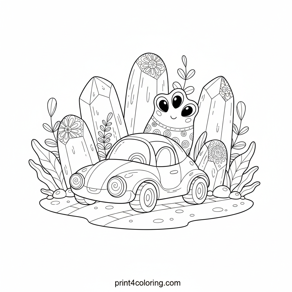 Join a sleek moon buggy as it ventures into a magnificent crystal cave on the moon! Discover towering, glowing crystals and exotic lunar plants that sparkle with magic. A friendly, multi-eyed alien creature peeks out, ready to share the wonders of this cozy cosmic hideaway. An out-of-this-world adventure awaits your colors!