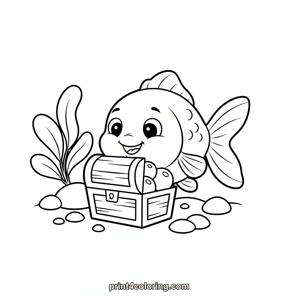 Join Finley the brave goldfish on an exciting underwater adventure! Little Finley has discovered a tiny, open treasure chest at the bottom of the tank, filled with sparkling surprises. Smooth pebbles and a friendly green plant surround our curious explorer. Grab your crayons and bring this delightful scene to life with vibrant colors!