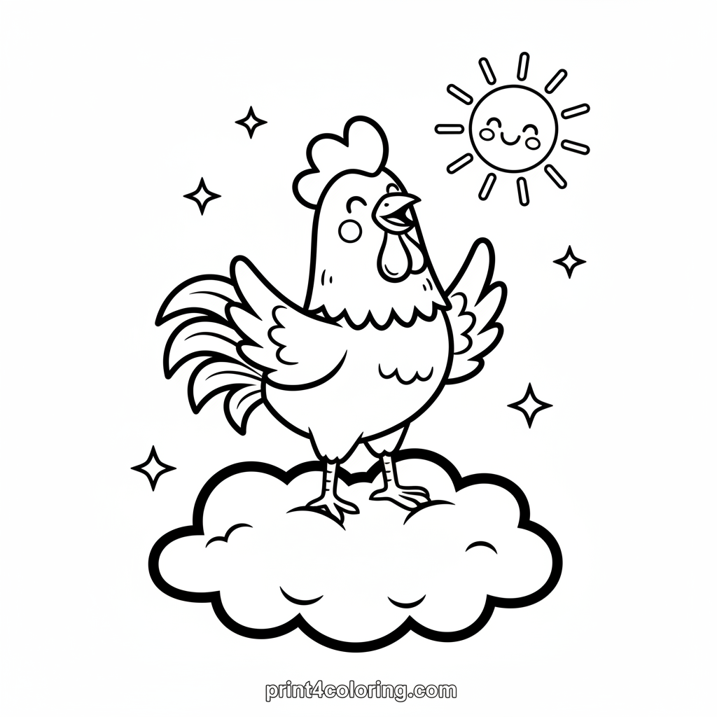 Meet our friendly rooster, perched high on a soft, fluffy cloud! He's gently crowing to welcome the new day, surrounded by countless sparkling stars in the deep night sky. This enchanting scene is perfect for little artists to bring to life with vibrant colors, creating a magical morning moment.