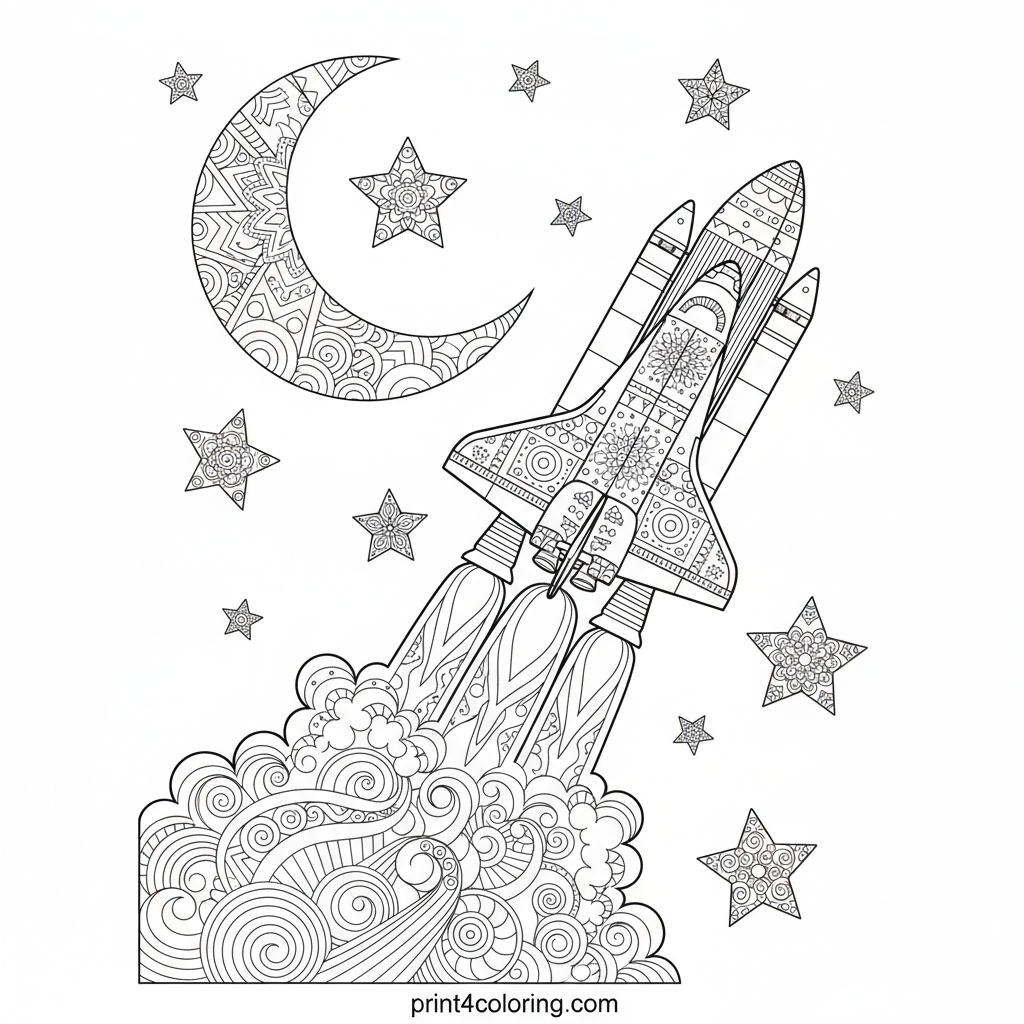 Witness the incredible power of a space shuttle blasting off into the cosmos! This dynamic scene captures the rocket mid-launch, with detailed flames and smoke featuring intricate geometric patterns. The background sparkles with zentangle stars and a crescent moon, offering a complex and rewarding coloring adventure for budding astronauts and artists.