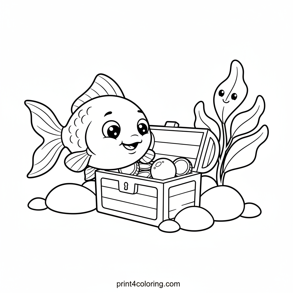 Dive deep with a brave little goldfish as it discovers a hidden treasure chest! Peeking inside, it finds sparkling wonders amongst smooth pebbles and a friendly green plant at the bottom of its tank. Get ready to add vibrant colors to this exciting underwater adventure!