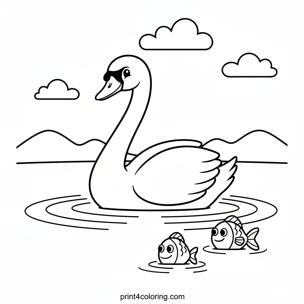 Imagine a beautiful swan, with its long, elegant neck, gently gliding across a peaceful lake. Watch the soft ripples it leaves behind as friendly fish peek up from the water to say hello. This lovely scene is perfect for bringing to life with your favorite colors. What colors will you choose for the swan and the shimmering water?