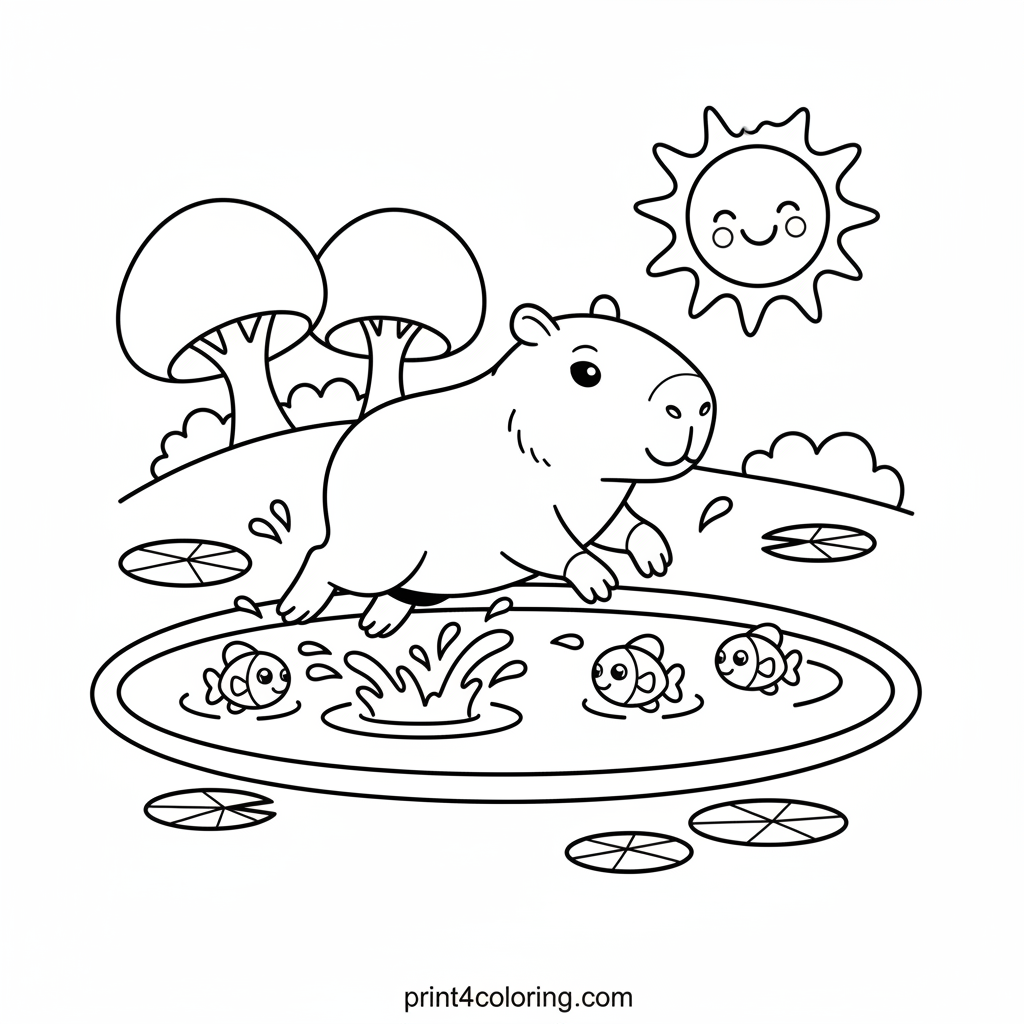 Join a cheerful capybara as it enjoys a gentle splash in a calm pond! Friendly little fish peek around its feet, curious about their new friend. This easy scene invites children to imagine a peaceful day by the water, perfect for brightening with warm browns, cool blues, and colorful fish.