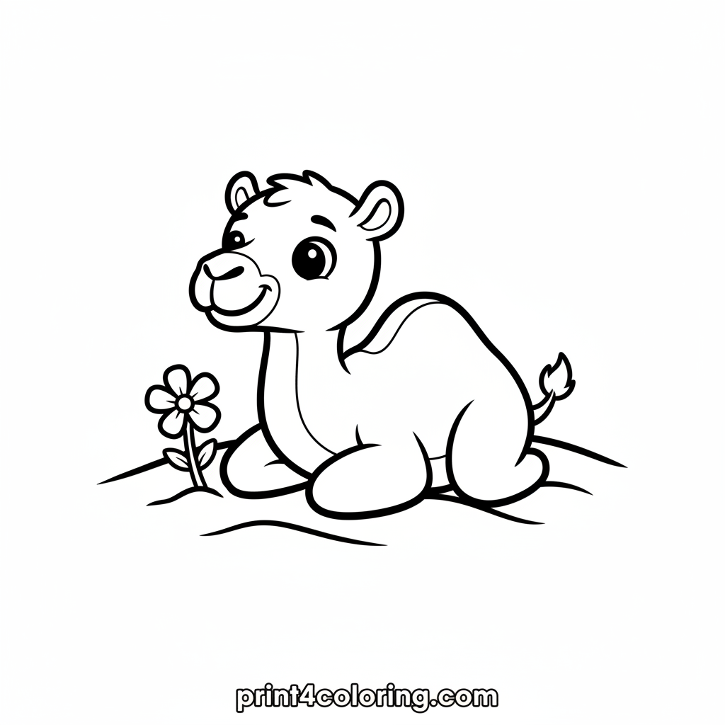 Meet our sweet baby camel, sitting peacefully in the warm desert sand! With its big, gentle eyes and a friendly smile, this little desert friend is ready for you to bring it to life with vibrant colors. A tiny, delicate flower near its nose adds a touch of charm to this adorable scene, perfect for young artists.